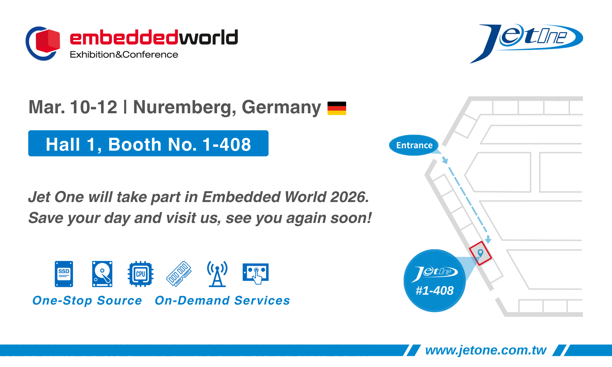 Jet One is attending Embedded World 2026 from Mar. 10-12 at Hall 1, Booth #1-408