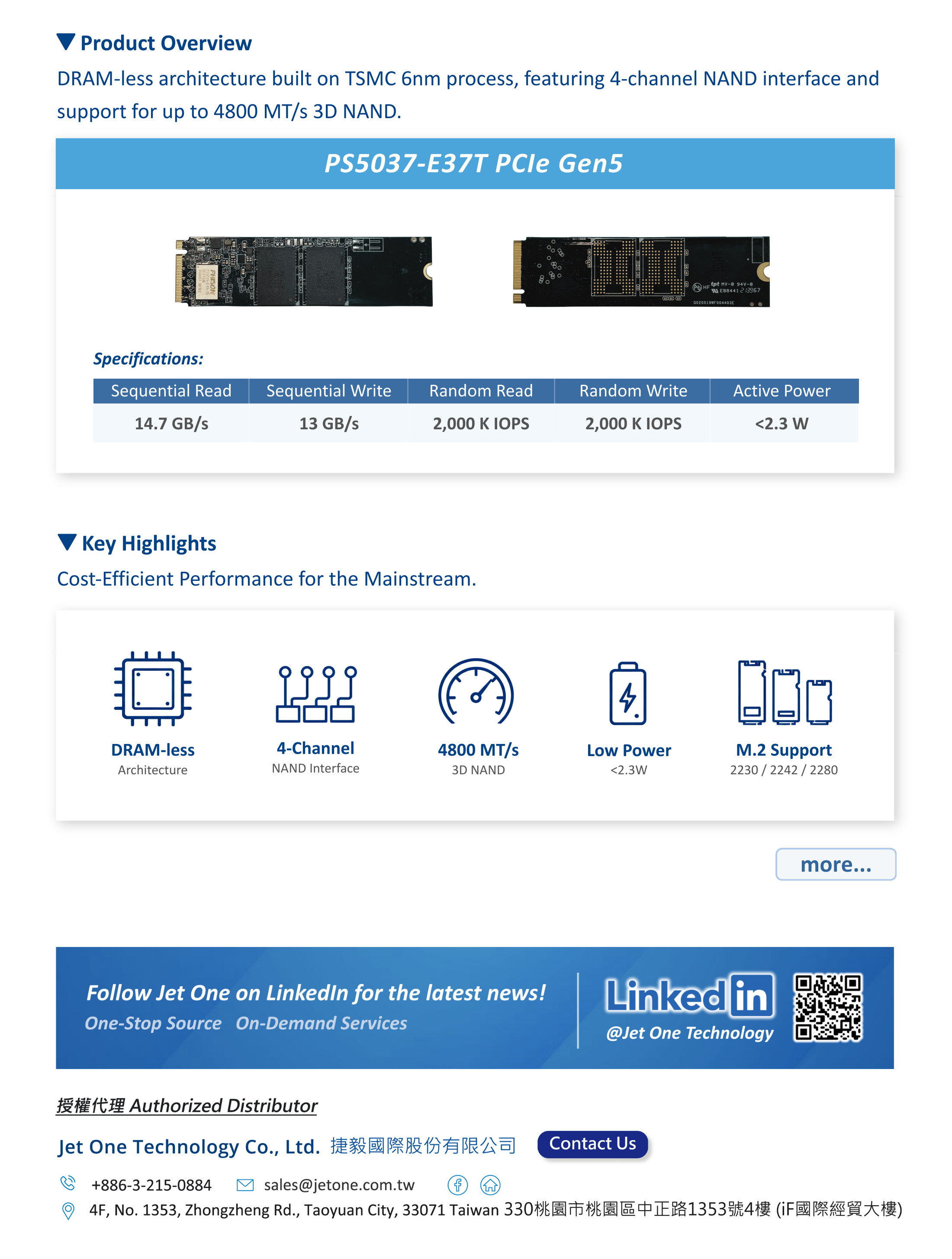 群聯電子最新E37T PCIe Gen5 SSD控制晶片,針對市場對高性價比解決方案的需求,在架構上進行多項優化。支援最新3D NAND,最高可達 4800 MT/s,整體效能提升 38%,於效能與成本之間取得最佳平衡。採無 DRAM 與 4 通道設計,適用於 M.2 2280、2242、2230 等規格,為筆電與輕薄型裝置提供最佳儲存方案。
